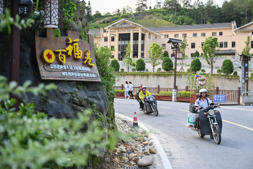 ↑2022年6月22日,村民驾驶摩托车行驶在下党村的公路上。