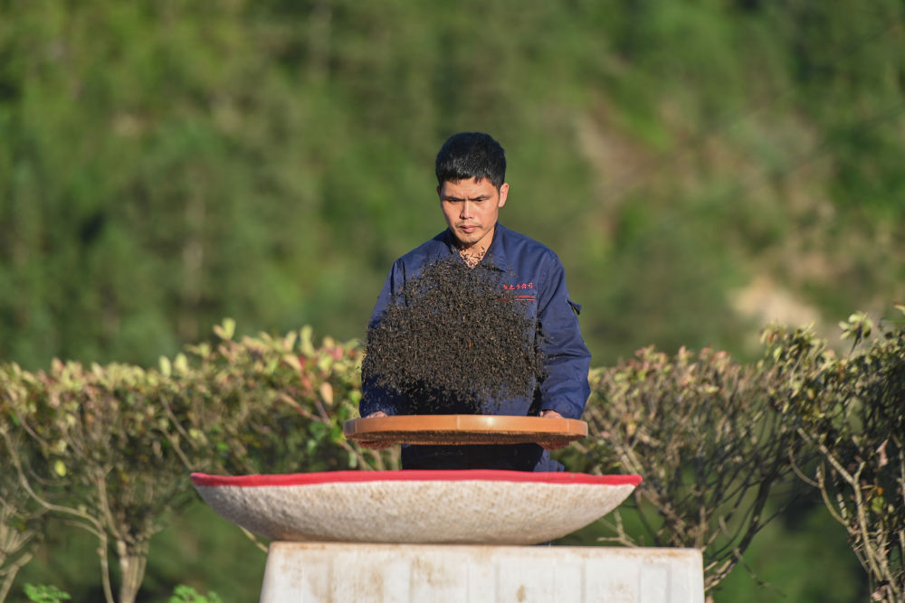 ↑2022年6月23日,村民周建伟在下党村的茶厂制茶。茶是下党村支柱产业之一,近300户村民种植茶叶。