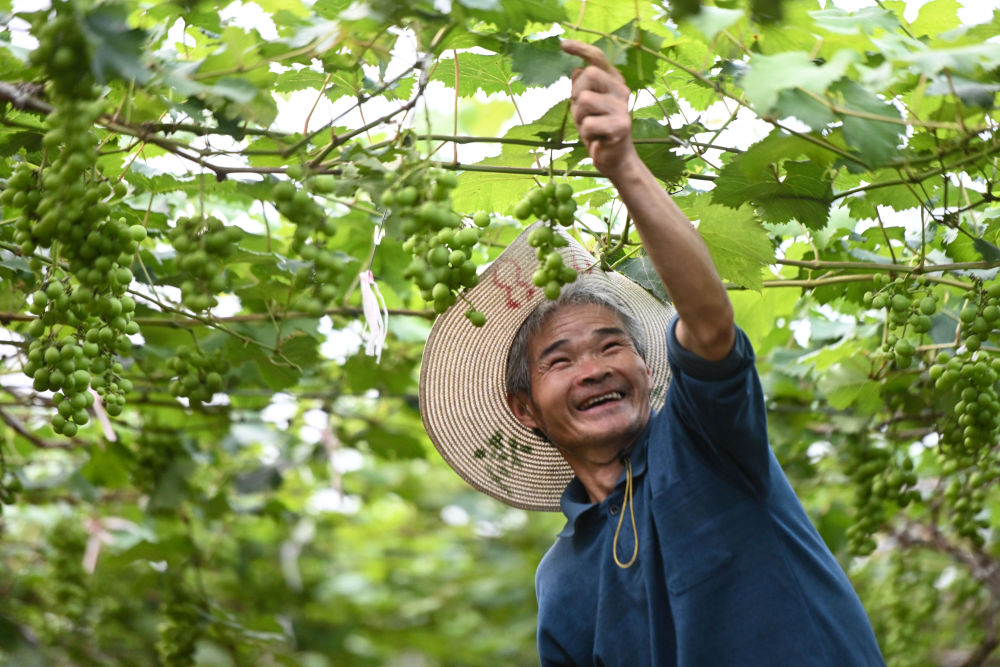 ↑2022年6月23日,村民吴通兴在下党村康庄葡萄园劳作。吴通兴在葡萄园一天收入200元。
