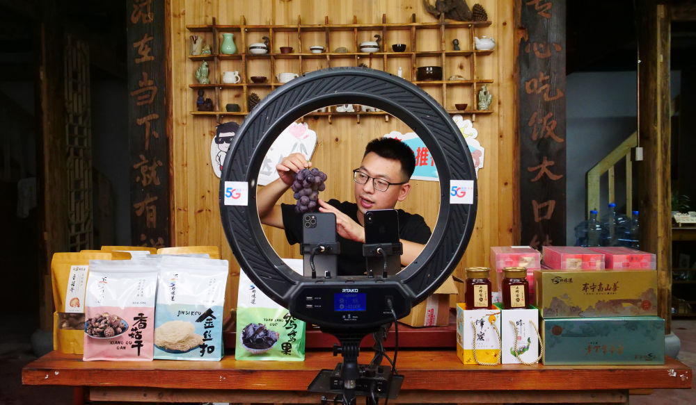 ↑2021年8月17日,返乡创业青年陈上友在下党村78号直播间向粉丝介绍当地的农产品。