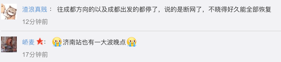 对此,西南铁路官方微博回应称:8月12日18时30分左右,铁路部门检查发现设备故障,现已开通线路,正在恢复运输秩序。受此影响,成都局管内部分线路列车将不同程度晚点运行。由此给您的出行带来不便,铁路部门深表歉意!同时提醒旅客朋友们随时关注列车时刻变化,具体情况详见站车公告或拨打12306铁路客服中心电话咨询。