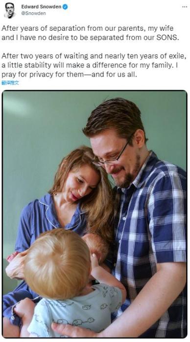 被给予俄公民身份后,斯诺登26日在社交媒体上写道,“与父母分离多年后,我和妻子不想与孩子们分离。在经历了两年的等待和近十年的流亡之后,一点点的安稳会给我的家庭带来不同”,他还表示,希望外界尊重自己和家人的隐私。