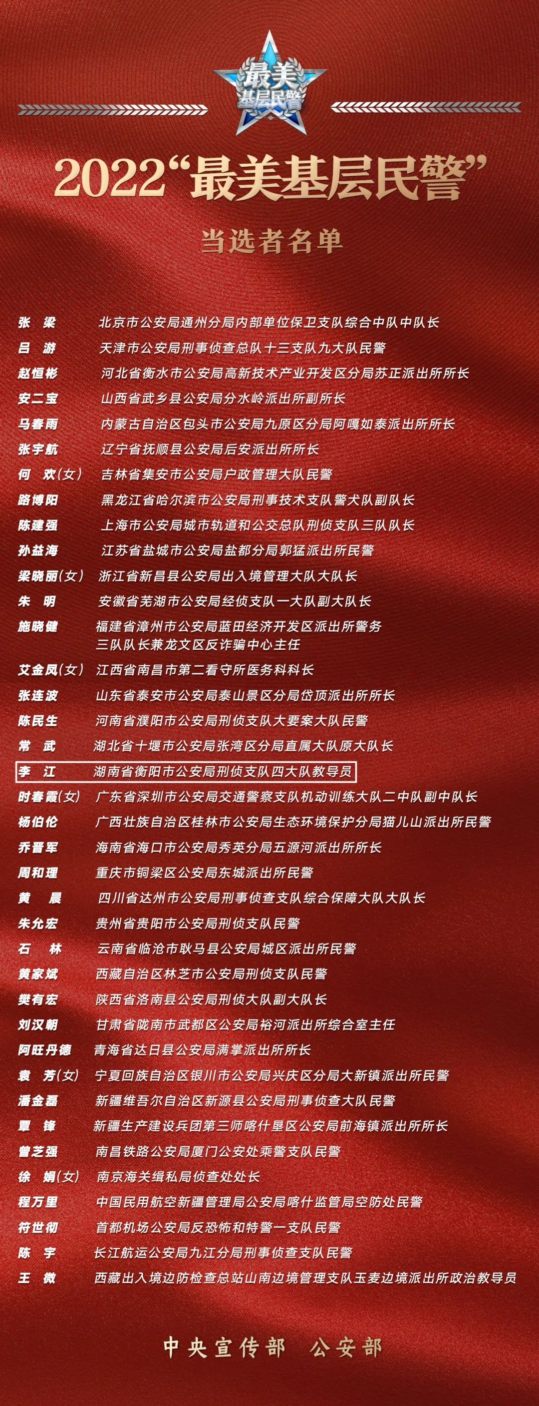 据了解,全国共有38名警察荣获2022年“最美基层民警”,我省衡阳市公安局刑侦支队四大队教导员李江名列其中。