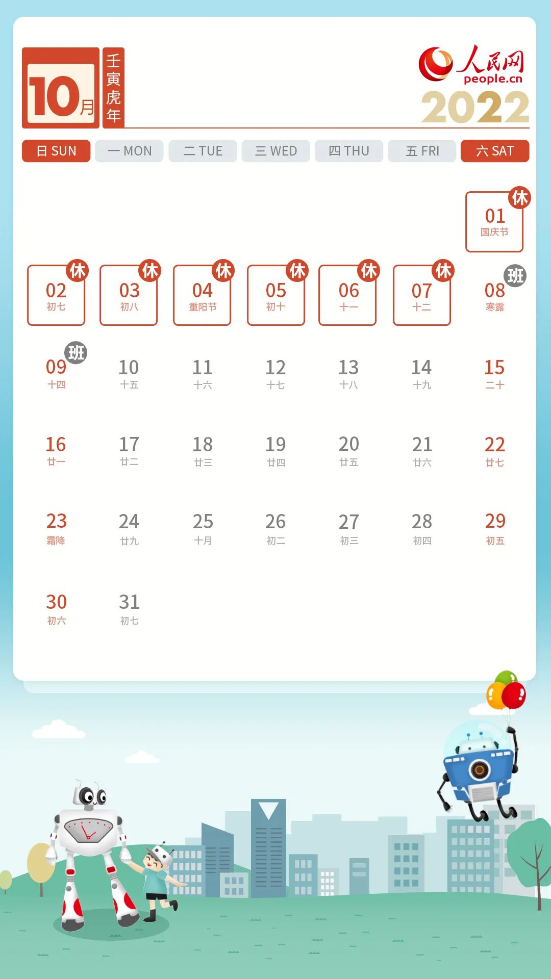 据中国政府网消息,国务院此前发布《关于2022年部分节假日安排的通知》。国庆节10月1日至7日放假调休,共7天,10月8日(星期六)、10月9日(星期日)上班。