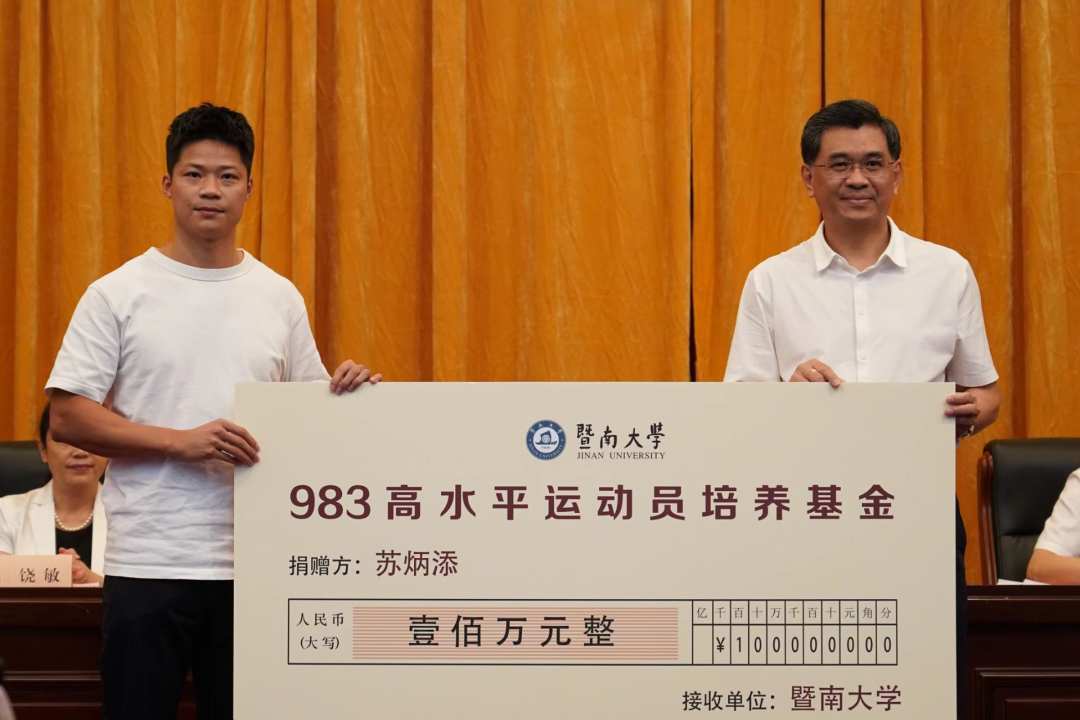 “从基层走到现在,我深知一名体育学子运动生涯的不容易,因此萌生了捐赠这笔奖金用于学生培养的想法。”苏炳添在发言时分享了获得记大功奖励的感受,以及推动设立“暨南大学983高水平运动员培养基金”的初衷。他表示,成立“暨南大学983高水平运动员培养基金”,主要就是用于培育和发展高水平运动员等,借此帮助激励他们勤奋学习、努力进取,助力国家体育和学校教育事业持续健康发展,为切实推动我国朝着体育强国之路迈进贡献绵薄之力。