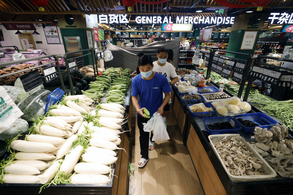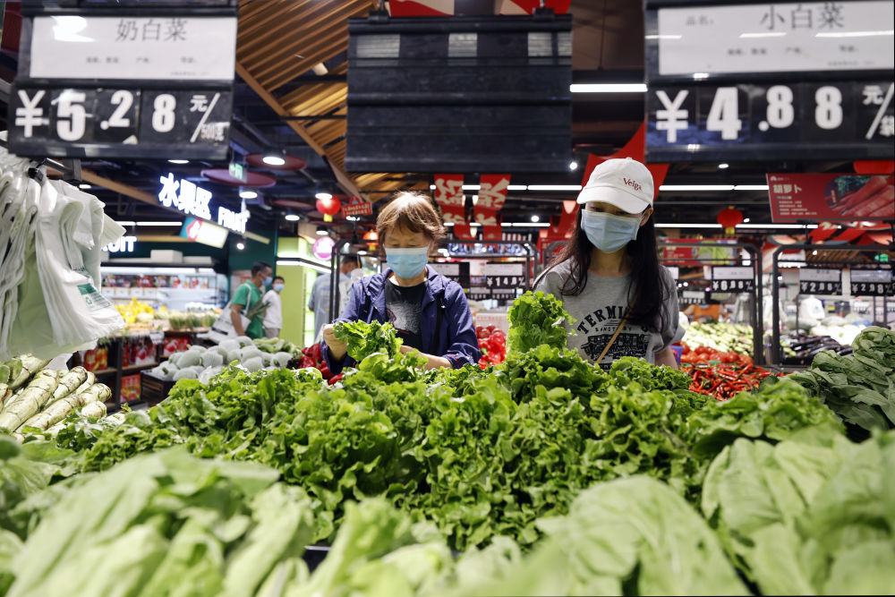 ↑9月2日,在成都益民菜市南苑店,市民在满足疫情防控要求的情况下有序短暂外出,购买蔬菜等生活物资。