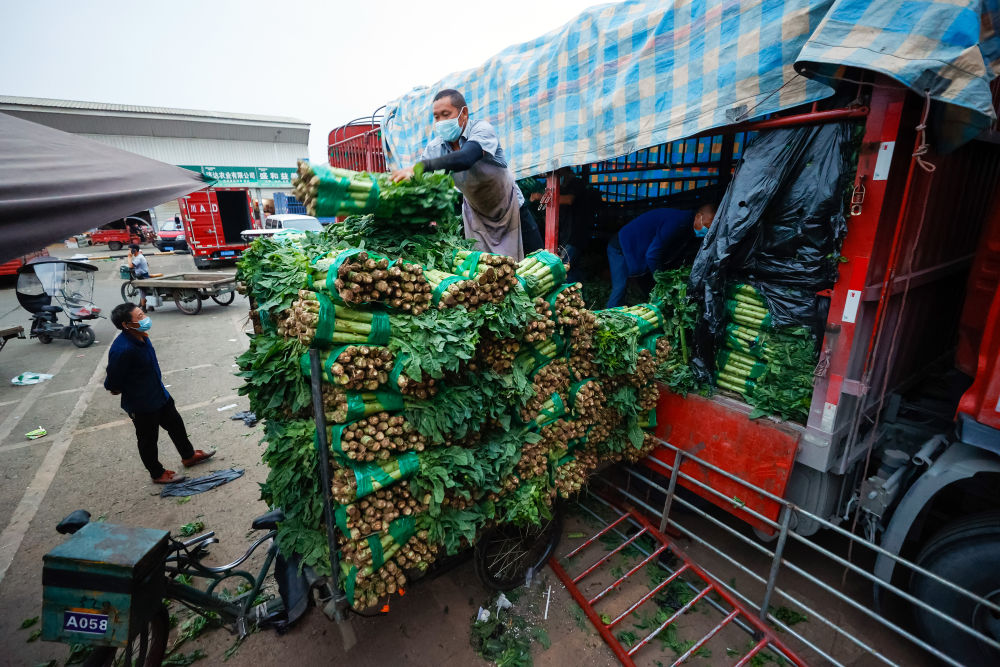 ↑9月2日清晨,成都农产品中心批发市场商户在准备蔬菜。
