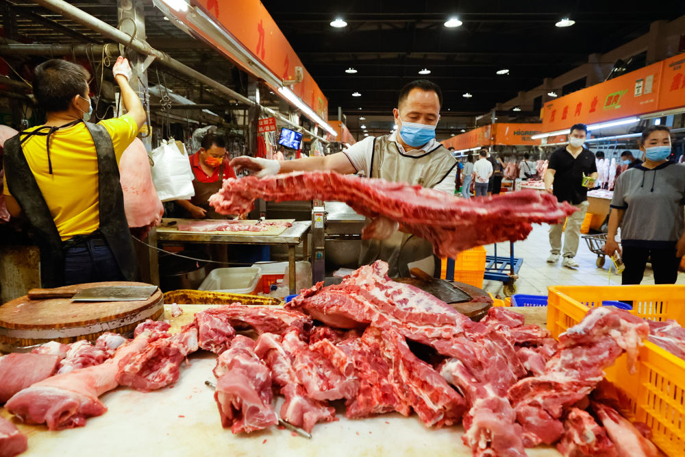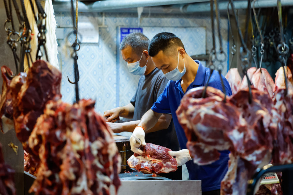 ↑9月2日清晨,成都农产品中心批发市场商户在准备肉类产品。