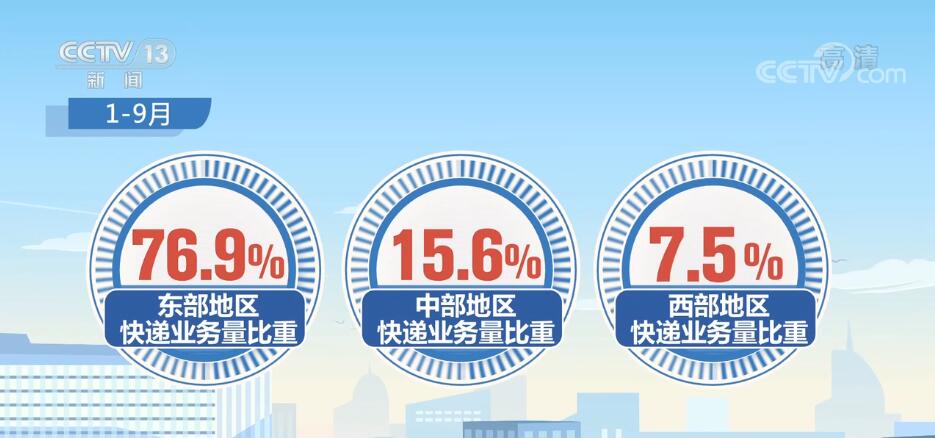 国家邮政局数据显示,1—9月,东、中、西部地区快递业务量比重分别为76.9%、15.6%和7.5%。与去年同期相比,东部地区快递业务量比重下降1.4个百分点;中部地区快递业务量比重上升1.3个百分点;西部地区快递业务量比重上升0.1个百分点。