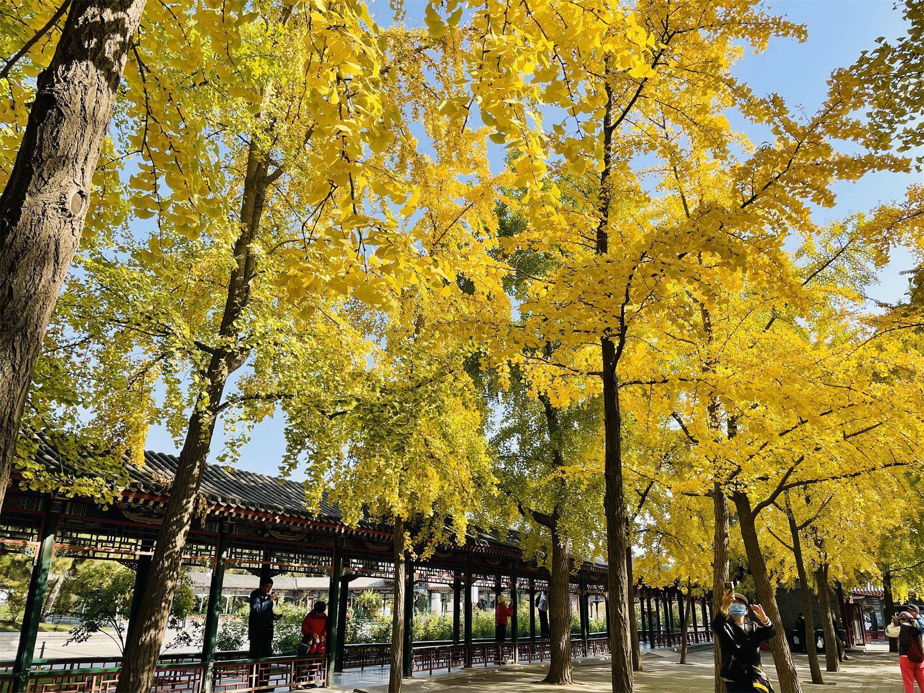中山公园南坛门内的“银杏大道”、景山公园东门南侧的“黄金大道”,让银杏在古典园林中彰显绚烂的独特魅力,高高抬起的枝叶交织成了密密匝匝的金黄色叶网,叶落后天空豁然开朗,林地下一地金黄,温暖而深邃,充满园林秋韵。