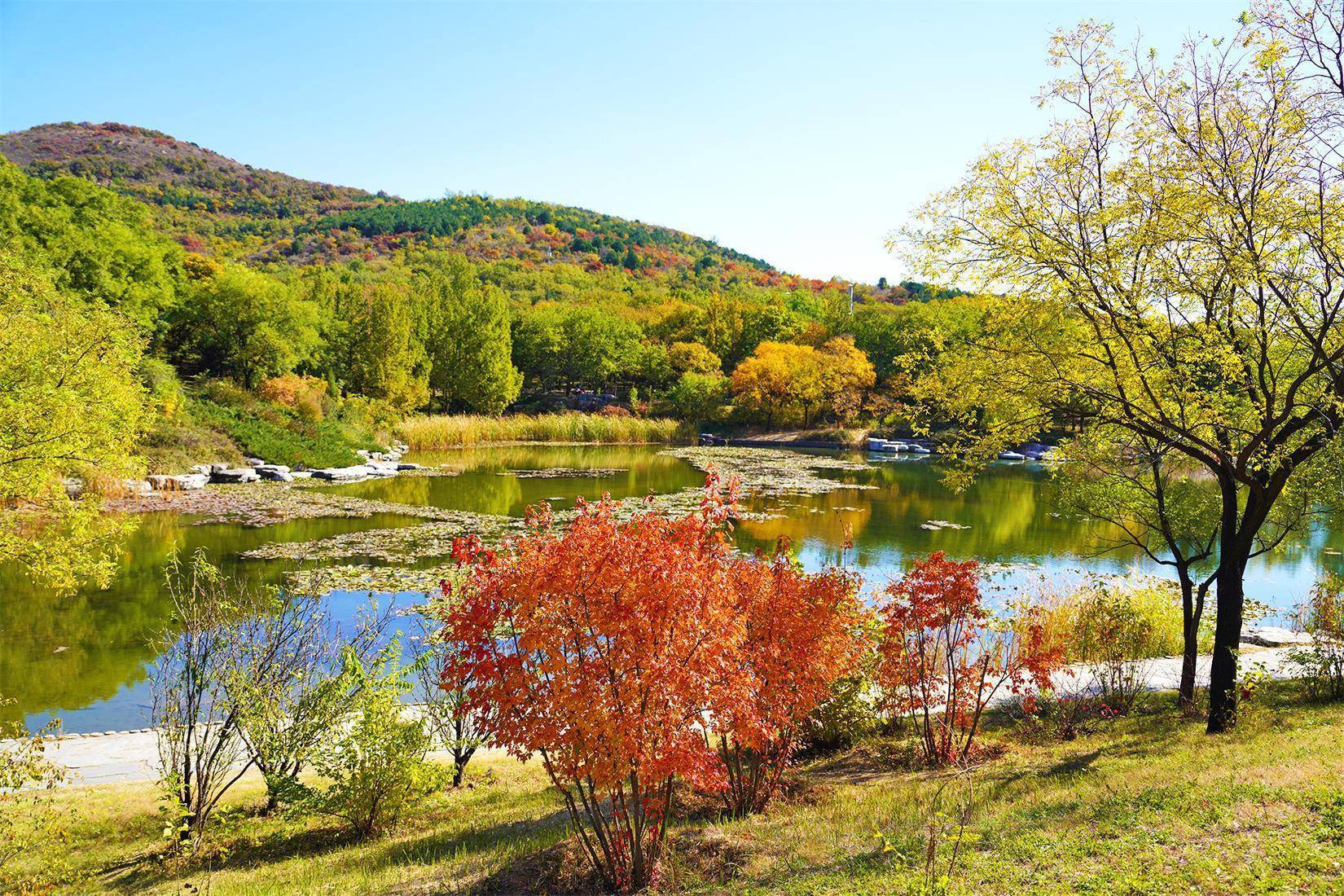 国家植物园(北园)的秋日世界绚丽多彩。北湖赏秋已经成为了市民游客秋季游园的传统项目,与春季繁花似锦不同,进入秋季,金枝槐、元宝槭、栾树等彩叶树种都换上秋装,与远处的山峰一同倒映在湖面上,色彩斑斓,绘制出一幅生动的秋日画卷。