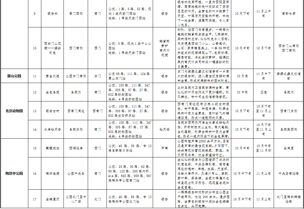 市公园管理中心提示:目前全市有多处彩叶观赏点,除了香山红叶,其他市属公园都有很好的秋季彩叶景观可以欣赏。大家可以多处赏秋景,错峰观彩叶。