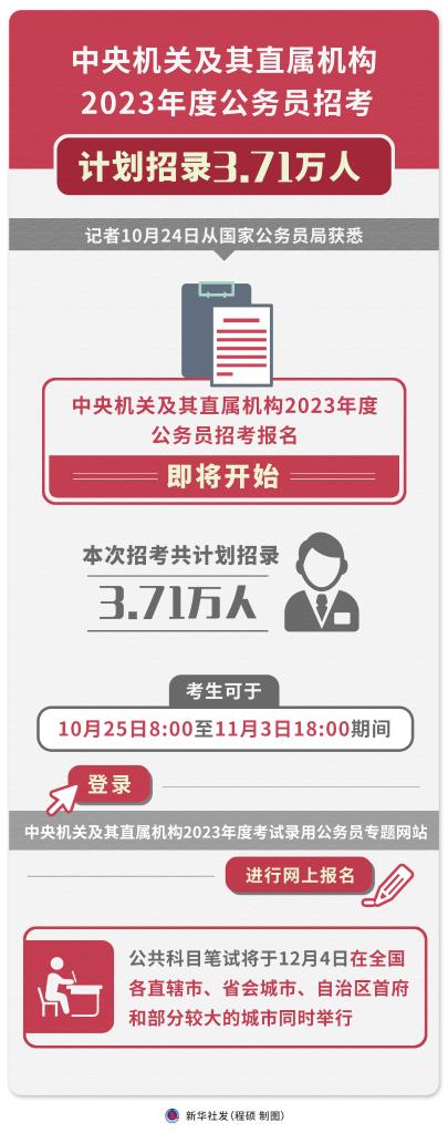新华社北京10月24日电 记者24日从国家公务员局获悉,中央机关及其直属机构2023年度公务员招考报名即将开始。本次招考共计划招录3.71万人。