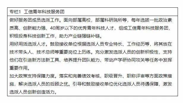 《意见》具体提出,要引导和支持政产学研等各方力量,着力培养一支政治素质高、创新活力强的青年科技人才队伍。组织实施工信青年科技服务团项目,引导优秀青年科技人才向重点企业流动。建立健全以信任为基础的青年科技人才支持机制,在重大项目资源分配等方面予以倾斜性支持,支持青年科技人才挑大梁、当主角。完善青年科技人才评价体系,加强和改进部系统高级职称评审工作,提高40周岁以下青年入选比例。提高部系统博士后流动(工作)站建设质量。