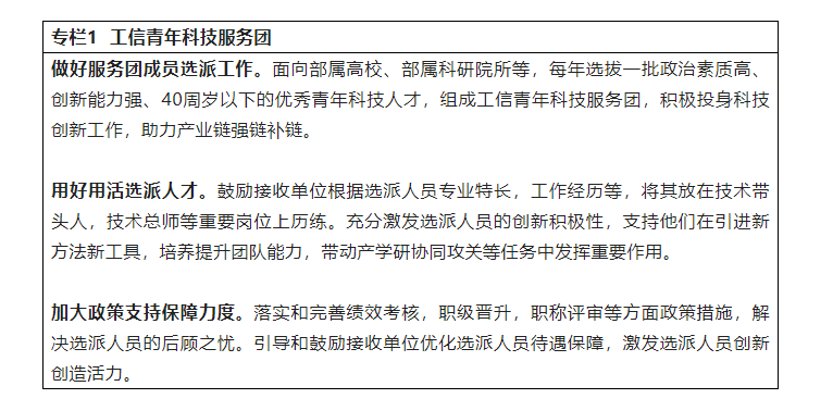 《意见》具体提出,要引导和支持政产学研等各方力量,着力培养一支政治素质高、创新活力强的青年科技人才队伍。组织实施工信青年科技服务团项目,引导优秀青年科技人才向重点企业流动。建立健全以信任为基础的青年科技人才支持机制,在重大项目资源分配等方面予以倾斜性支持,支持青年科技人才挑大梁、当主角。完善青年科技人才评价体系,加强和改进部系统高级职称评审工作,提高40周岁以下青年入选比例。提高部系统博士后流动(工作)站建设质量。