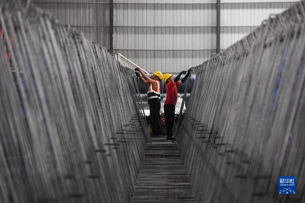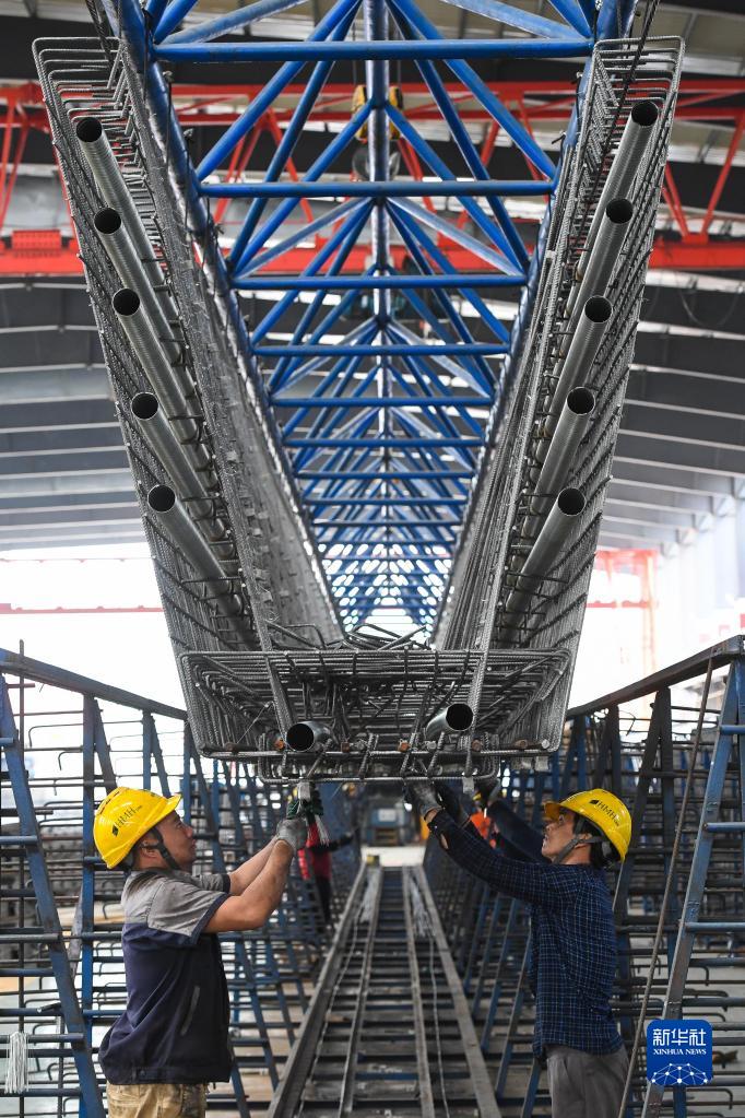 10月18日,工人在黄茅海跨海通道智慧梁场绑扎预制箱梁钢筋笼。