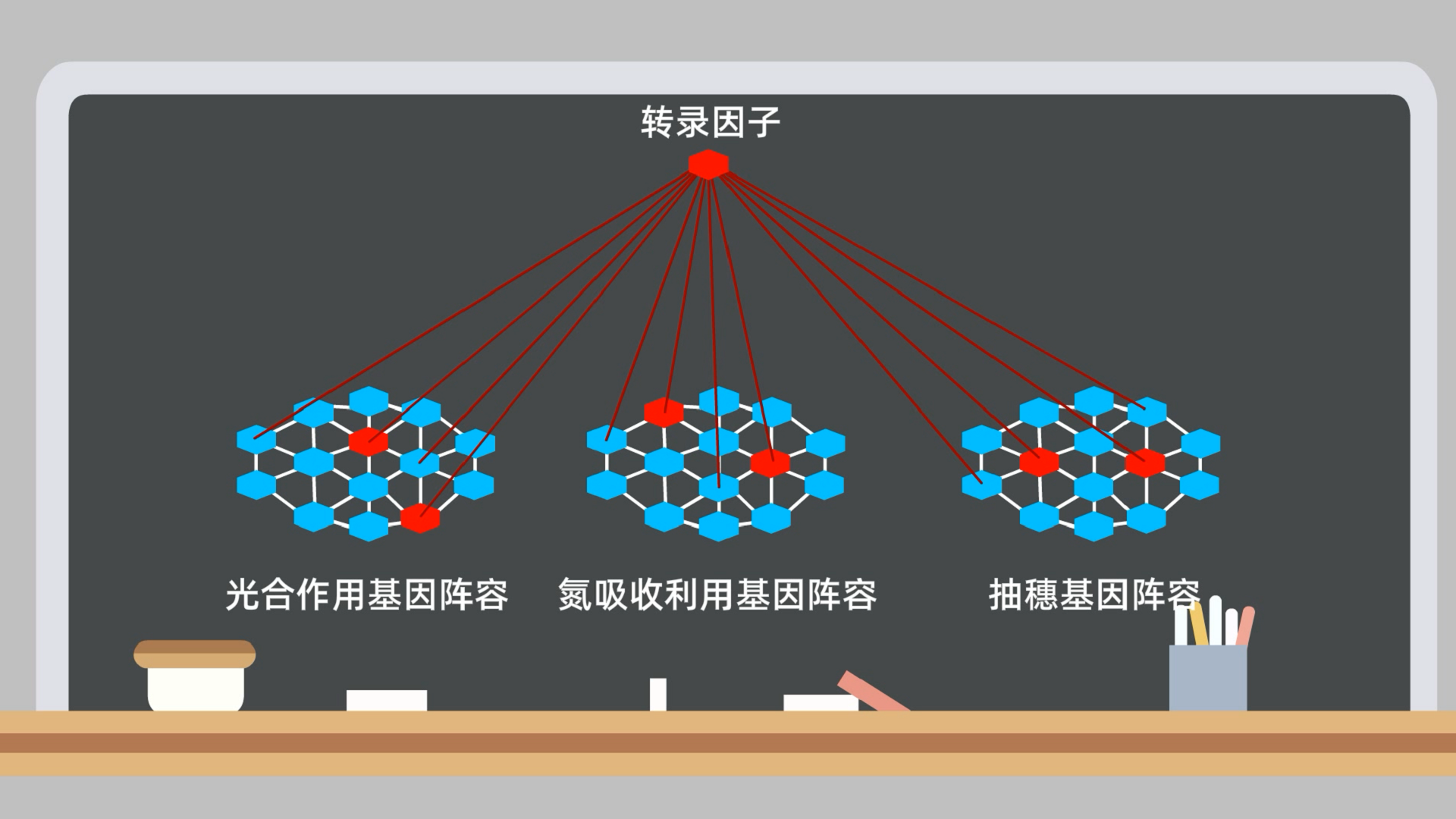 而新发现的水稻高产基因OsDREB1C是一个转录因子,它就像是一个“分子开关”,在这个通路的最上面,下面有控制光合作用、氮素吸收利用以及开花等途径的很多基因,这个基因的表达量提高以后,通过基因调控的网络,把下游的光合作用基因、氮吸收高效利用基因以及影响抽穗期的基因都启动了,从而协同调控水稻的光合效率、氮素利用效率以及抽穗期。