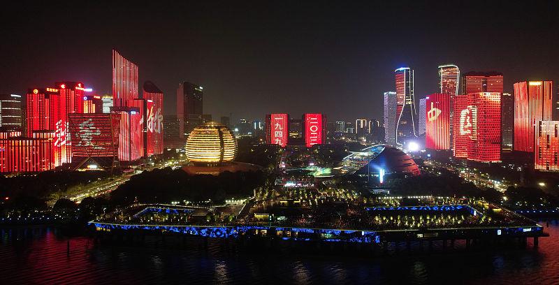 2022年10月1日晚,一场流光溢彩的国庆主题灯光秀在杭州钱江新城上演。