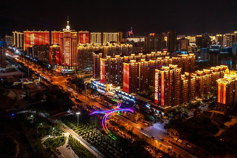 2022年9月30日晚,山西运城,中心城区上演“盛世华诞 欢度国庆”主题灯光秀,喜迎国庆佳节。