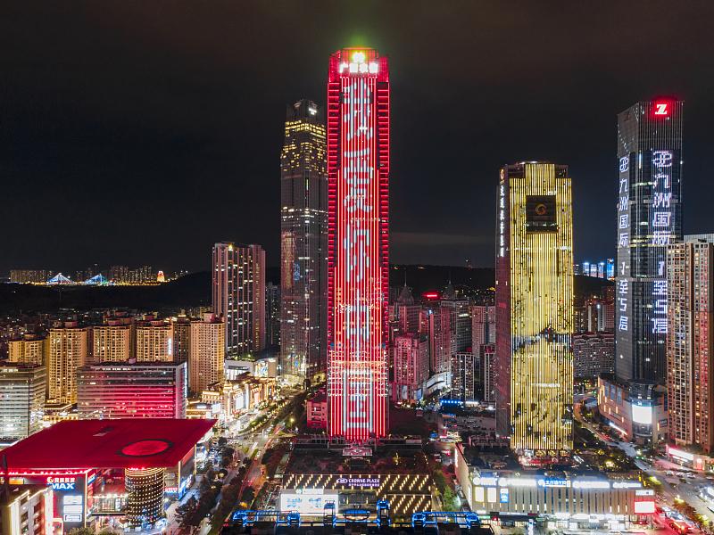 2022年9月30日,南宁,东盟商务区的楼宇开启了国庆灯光秀。