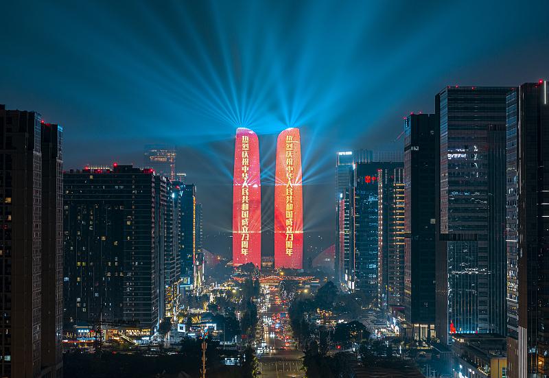 2022年10月1日晚,成都,天府双塔上演灯光秀,庆祝国庆。