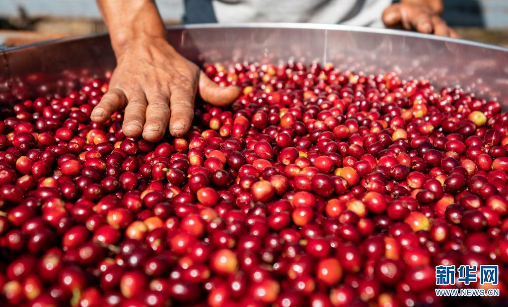 11月16日,在云南省普洱市野鸭塘河谷咖啡庄园,农民整理收获的咖啡果。新华社记者 江文耀 摄