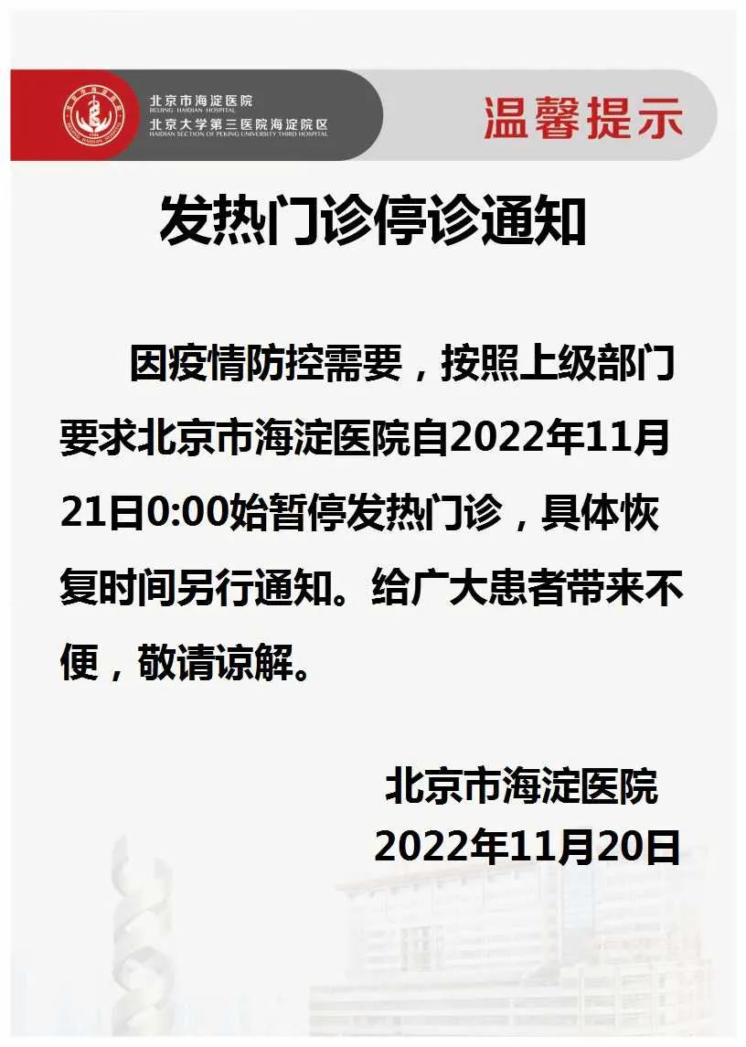 今天早上,北京市海淀医院发布通知:因疫情防控需要,2022年11月21日0时起,海淀医院发热门诊暂停接诊,恢复时间另行通知。