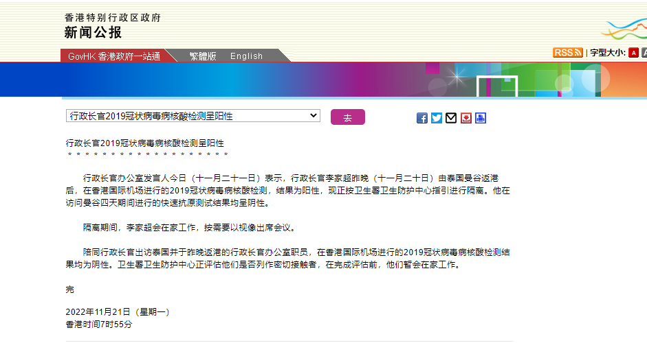 据香港特区政府新闻公报消息,香港特区行政长官办公室发言人今日(21日)表示,行政长官李家超昨晚(20日)由泰国曼谷返港后,在香港国际机场进行的新冠病毒核酸检测,结果为阳性,现正按卫生署卫生防护中心指引进行隔离。他在曼谷4天期间进行的快速抗原测试结果均呈阴性。隔离期间,李家超会在家工作,按需要以视像出席会议。