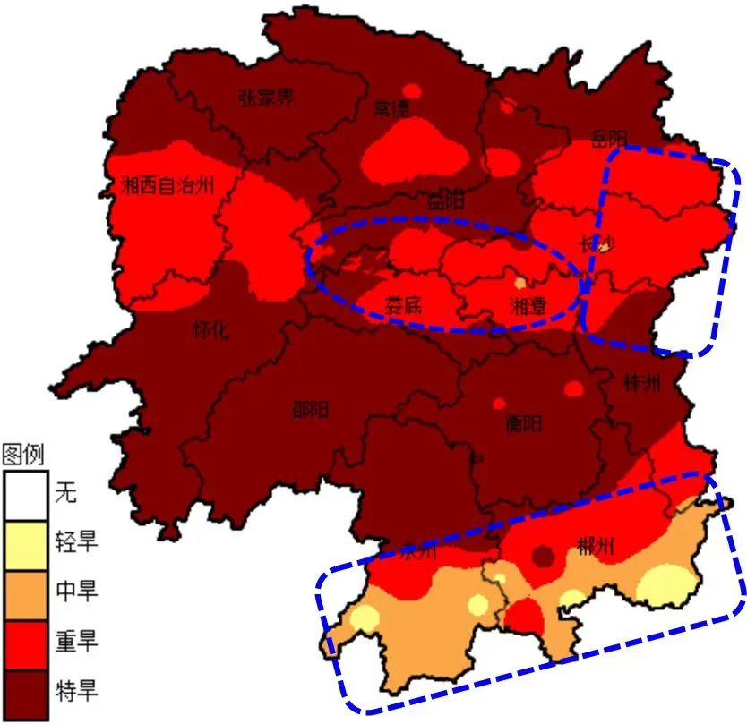 8月上旬开始,气象干旱迅速发展加重。截至10月24日,湖南地区气象干旱综合强度成为1961年以来历史第1位。湘北地区9月20日至23日、10月6日至9日、26日至30日, 湘南南部11月2日晚至6日受降雨和人工增雨作业影响,干旱情况有所缓和。目前气象干旱过程已持续118天。
