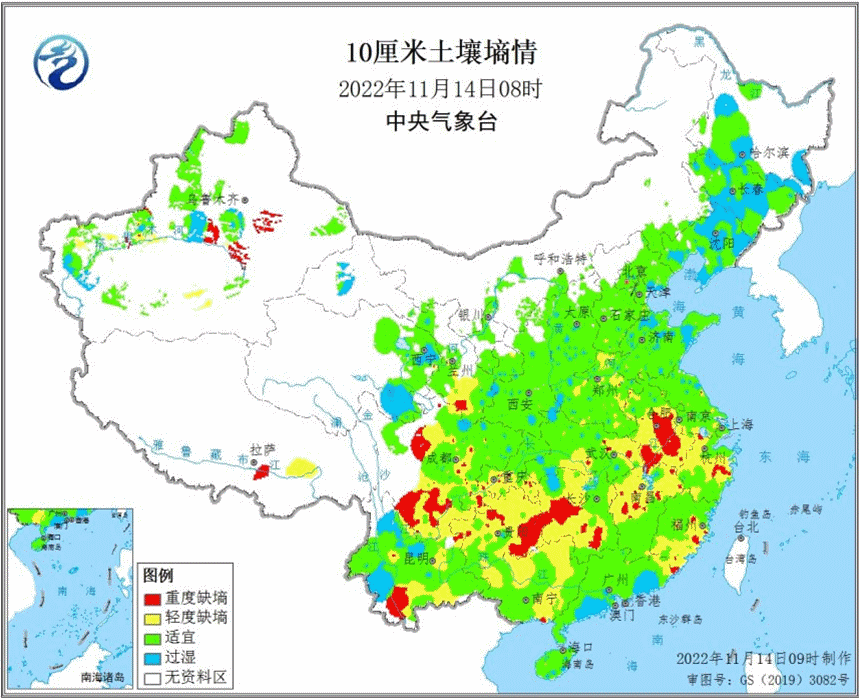 本轮南方降水过程(14日至18日),江西、湖北东南部、浙江北部、安徽南部、湖南中南部等地土壤缺墒情况有所缓解。