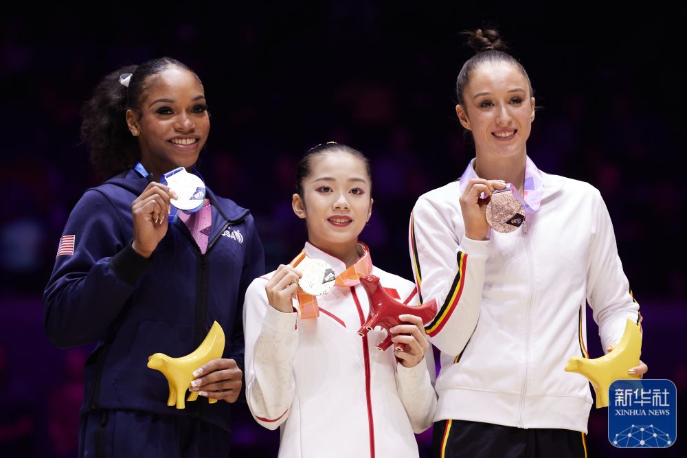 ↑冠军中国选手韦筱圆(中)、亚军美国选手琼斯(左)和季军比利时选手德瓦埃勒在颁奖仪式上合影。新华社记者 孟鼎博 摄