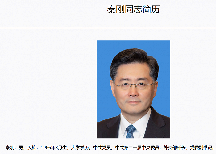 外交部网站“部长简历”栏目消息显示,外交部公布外交部部长秦刚简历: