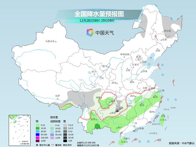 明天(28日),内蒙古东北部和中部、黑龙江西部、东北地区东部、西藏南部和东部、湖南西部、西南地区北部和东南部、云南西北部等地部分地区有小到中雪,其中,湖南西部、贵州中东部等地部分地区有大雪(5~6毫米)。江南中北部、湖北东部、浙江大部、江南南部、西南地区东北部和南部、华南北部和西部、台湾岛等地部分地区有小雨,其中,云南东南部等地部分地区有中雨。