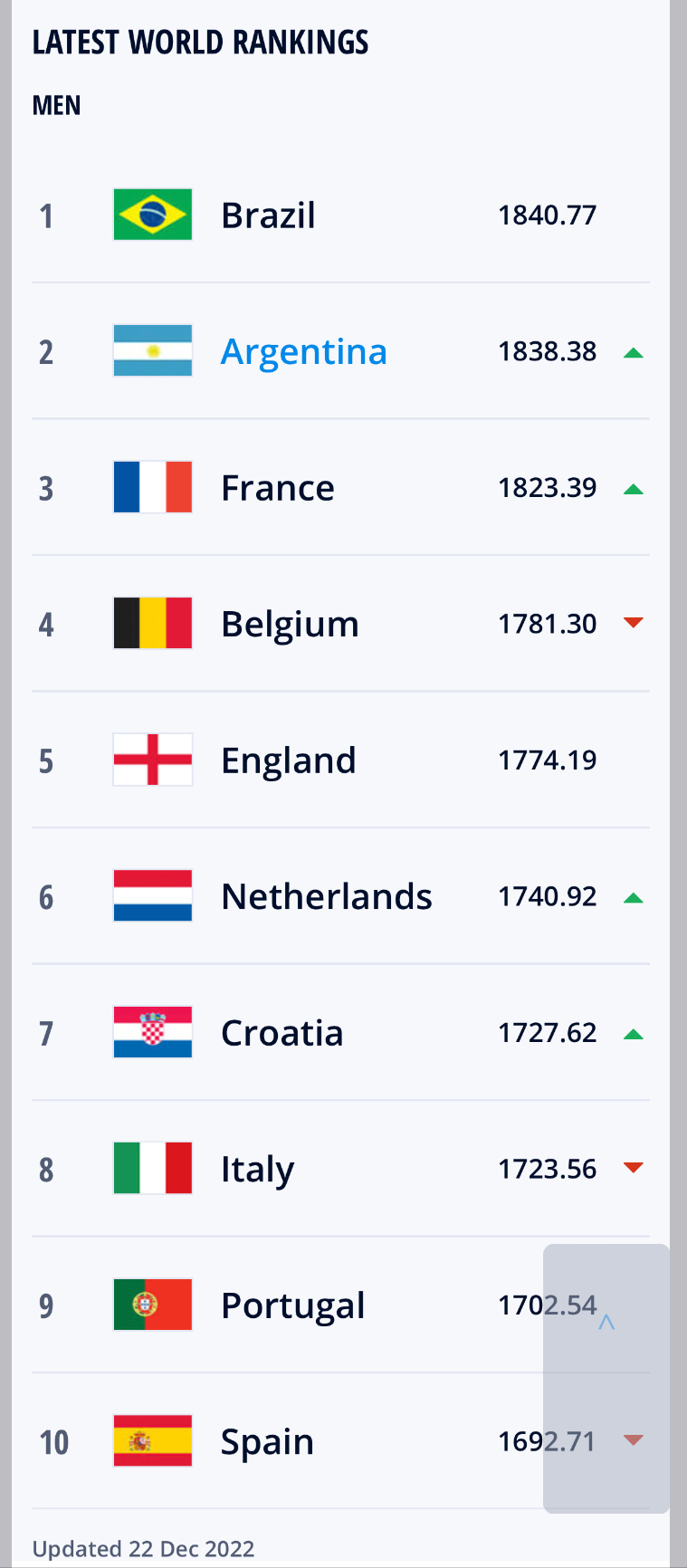 1、巴西 2、阿根廷 3、法国 4、比利时 5、英格兰 6、荷兰 7、克罗地亚 8、意大利 9、葡萄牙 10、西班牙