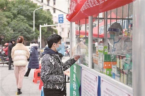 12月20日,患者在湖南省长沙市开福区望麓园街道社区卫生服务中心发热诊疗站取药。近日,湖南长沙等地将核酸采样屋、便民服务亭等改造为发热诊疗站,为群众就近就医提供便利。新华社 发