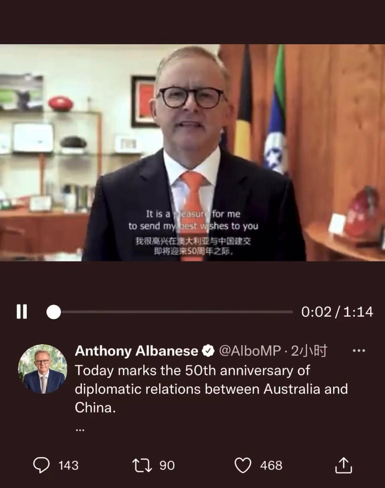 在飞机落地的第一时间,黄英贤就在社交媒体表示,“我们将讨论很多话题,我们也将在可以合作的领域去进行合作”。而在北京时间的今天早上,澳大利亚总理阿尔巴尼斯在其社交媒体账号发布了对于两国建交50周年纪念日的视频致辞,并积极评价了中澳关系。在视频中他表示,澳大利亚寻求与中国建立稳定的关系。他说,中国已经发展成为世界最大的经济体之一,也是澳大利亚最大的贸易伙伴,澳中之间的贸易和联系为两国都带来益处,稳定的澳中关系有利于实现互惠互利。