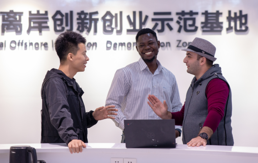 (在海口复兴城国际离岸创新创业示范基地,来自格鲁吉亚的乔智(右)和伙伴在讨论问题。海南日报记者 袁琛 摄)