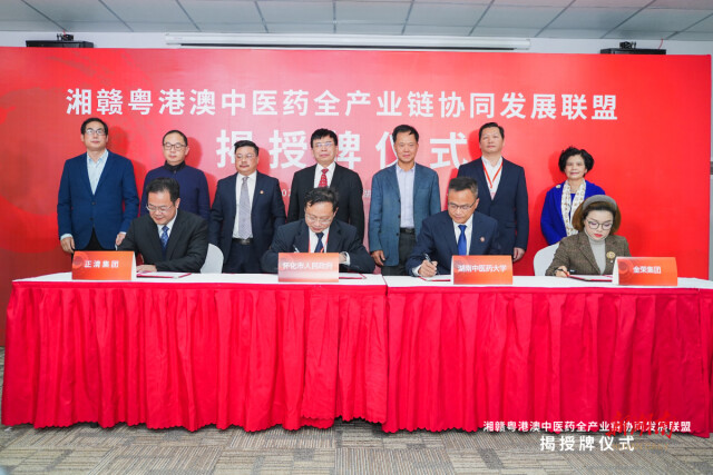 湘赣粤港澳中医药全产业链协同发展联盟主席、中国工程院院士刘良,湖南省政协港澳台侨和外事委员会主任王玉立,湖南中医药大学党委书记戴爱国,省中医药管理局副局长曾清共同为湘赣粤港澳中医药全产业链协同发展联盟秘书处揭牌。湘赣粤港澳中医药全产业链协同发展联盟中药材合作中心、中医药科技创新合作中心、中医药产业化合作中心、中医药商贸合作中心四大“合作中心”也正式授牌成立。
