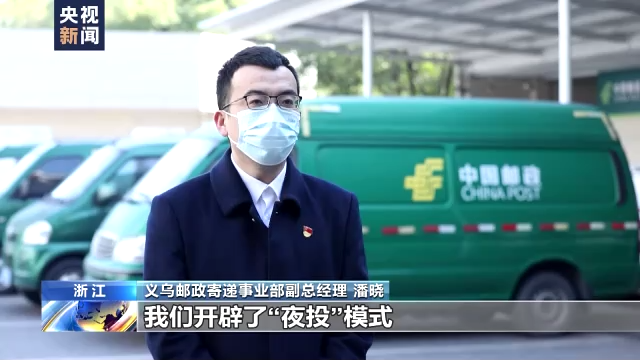 义乌邮政寄递事业部副总经理 潘晓:针对派送的最后一公里,我们开辟了“夜投”模式,延长派件时长4~5小时,希望最终达到让邮件可以安全快速到大家手中的目的。