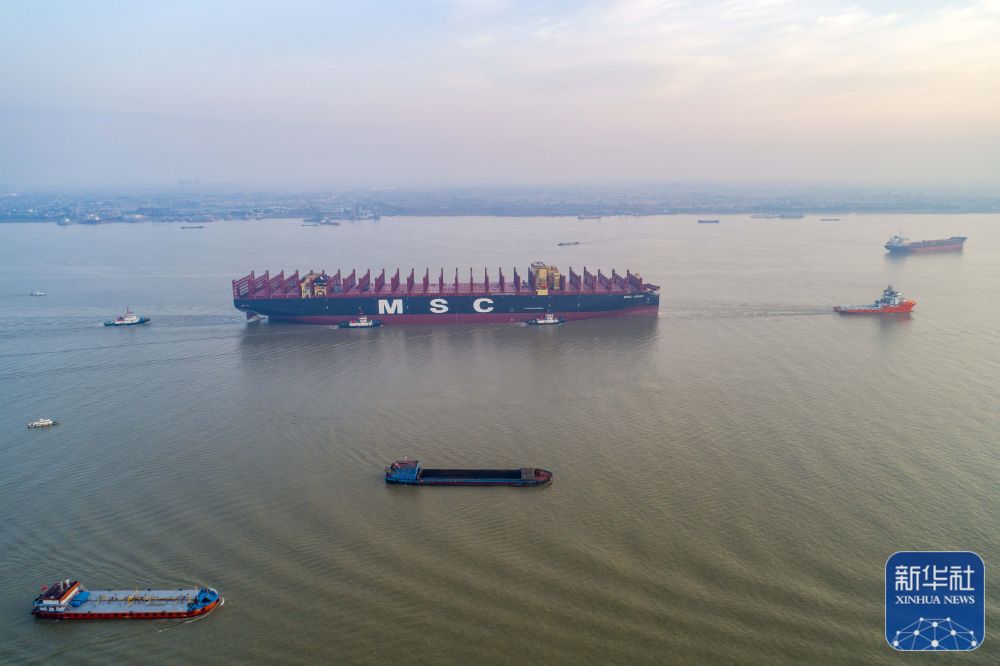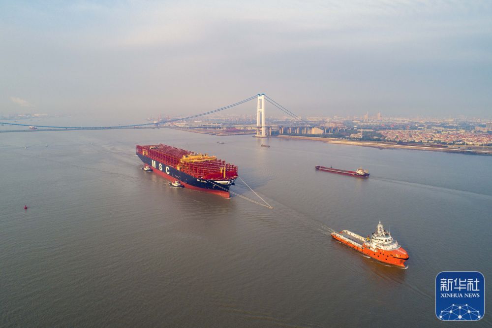 当日,“鑫福102”轮在江苏泰兴扬子鑫福船厂离泊进入长江拖航作业。“鑫福102”轮总长399.99米,型宽61.3米,一次可装载24346个标准集装箱,是目前全球最大装箱量新造集装箱船。