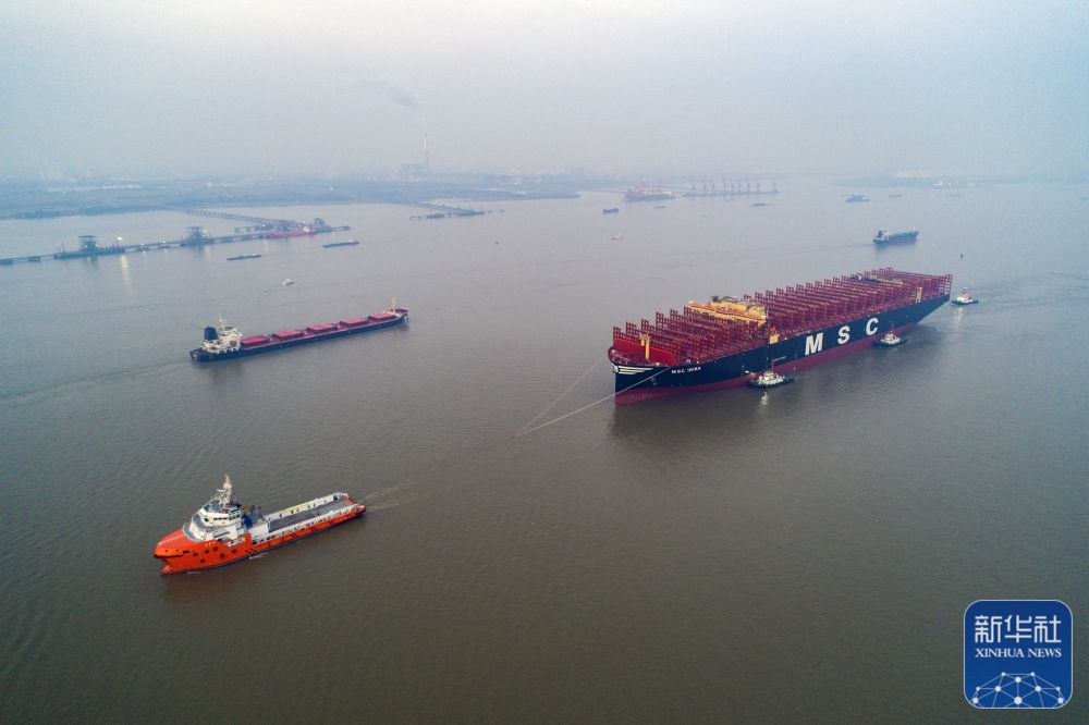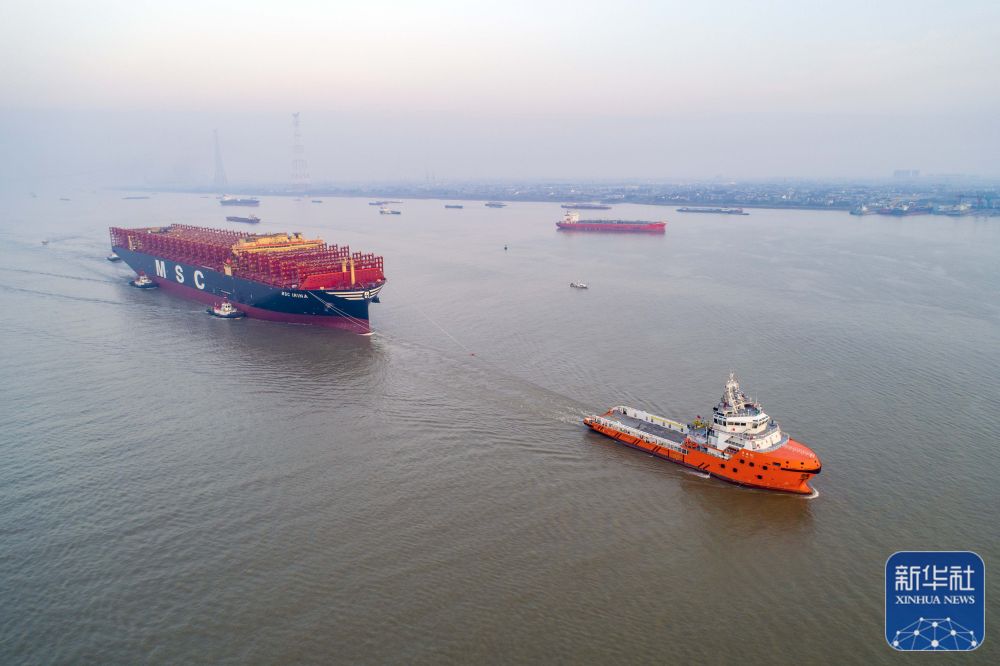 全球最大新造集装箱船进入长江拖航作业
