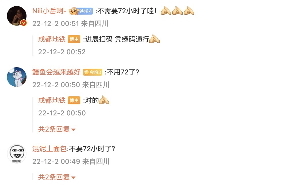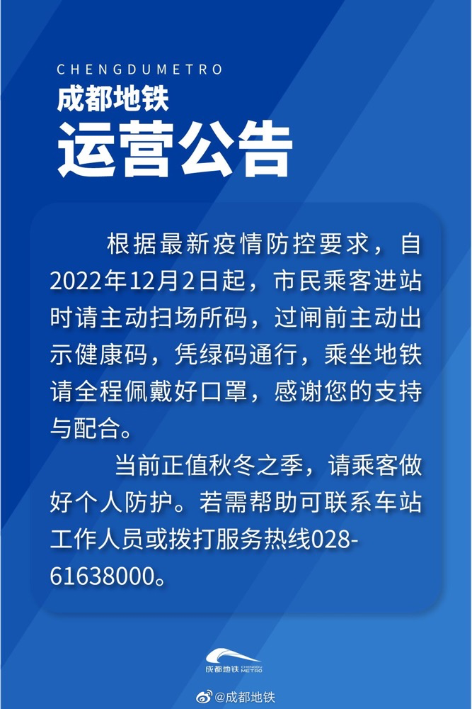 12月2日,成都地铁发布《运营公告》,根据最新疫情防控要求,自2022年12月2日起,市民乘客进站时请主动扫场所码,过闸前主动出示健康码,凭绿码通行,乘坐地铁请全程佩戴好口罩。当前正值秋冬之季,请乘客做好个人防护。