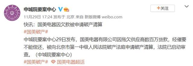 12月2日,向法院申请对国美执行破产结算的机构中城院要案中心发布声明称,法院已开展形式审查,通知国美应该只是时间问题。
