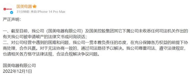12月1日深夜,针对近期国美被申请破产清算的消息,国美发布声明称,截至目前,我公司(国美电器有限公司)及国美控股集团其它下属公司未收悉任何司法机关作出的有关我公司被申请破产的法律文书或问询谈话。