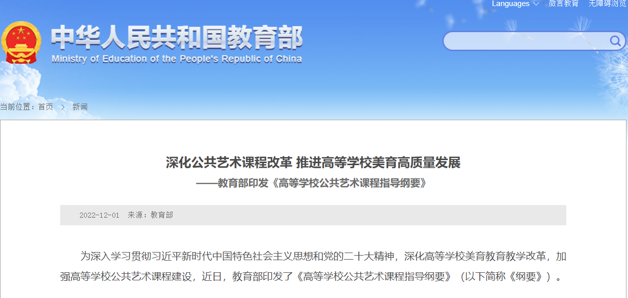 12月1日,据中华人民共和国教育部官网消息,为深化高等学校美育教育教学改革,加强高等学校公共艺术课程建设,近日,教育部印发了《高等学校公共艺术课程指导纲要》,规定高校本科学生修满公共艺术课程2个学分方能毕业。具体通知内容如下: