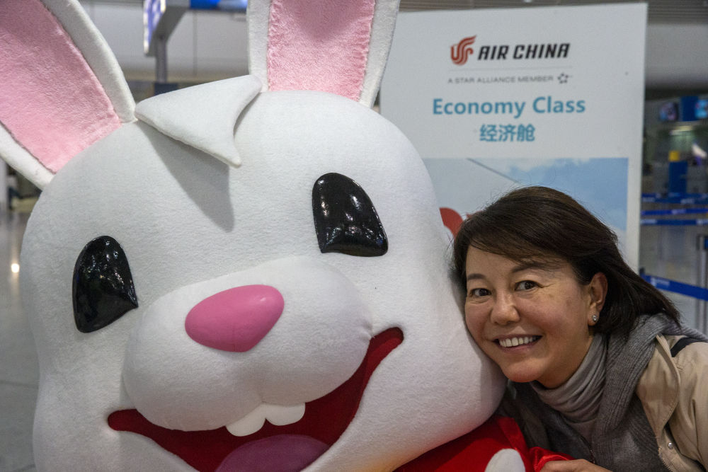 ↑1月26日,在希腊雅典国际机场,一名准备搭乘航班前往中国的乘客与装扮成兔子造型的工作人员合影。新华社发(马里奥斯·罗洛斯摄)