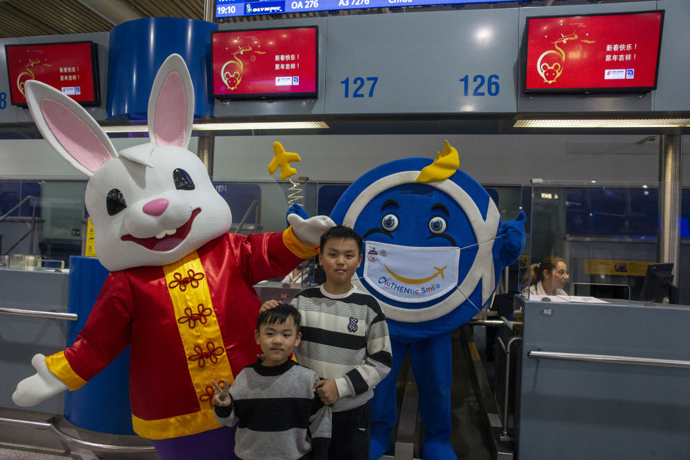 ↑1月26日,在希腊雅典国际机场,两名准备搭乘航班前往中国的小乘客与装扮成兔子造型的工作人员合影。新华社发(马里奥斯·罗洛斯摄)
