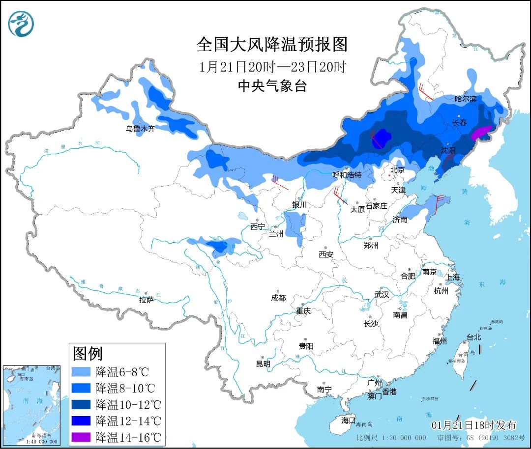 其中,1月21日20时至1月23日20时,内蒙古大部、东北地区中南部、新疆北部、甘肃河西、宁夏南部、山西北部、河北北部等地部分地区将先后降温6~8℃,内蒙古中东部、吉林东部、辽宁等地大部降温可达10~14℃。上述部分地区并伴有4-6级风,阵风7-8级。北部和东部海区有6~8级风,阵风9级左右。