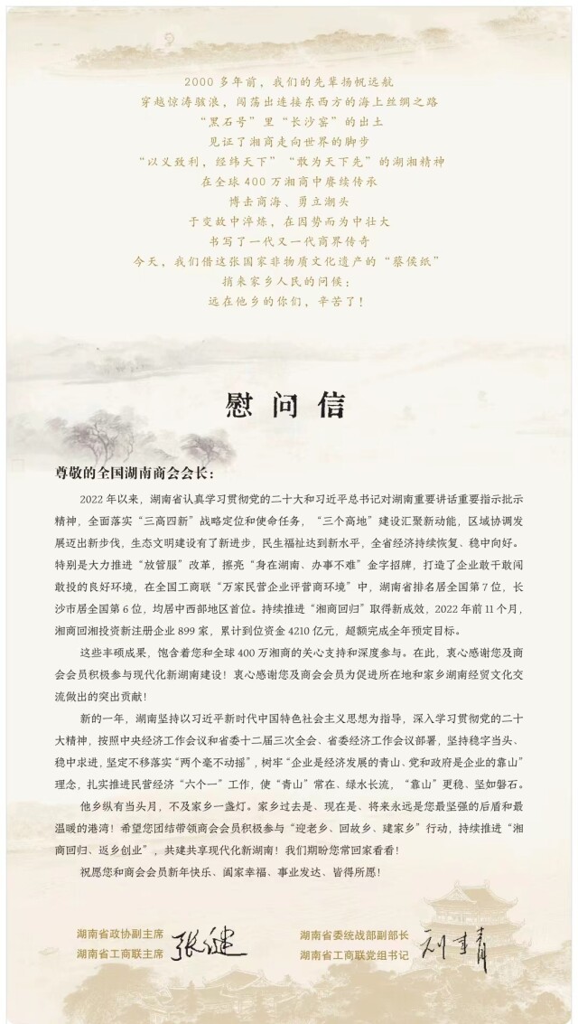 值此新春佳节来临之际,湖南省工商联(总商会)向全球湘商和商协会会员致以诚挚的春节问候!