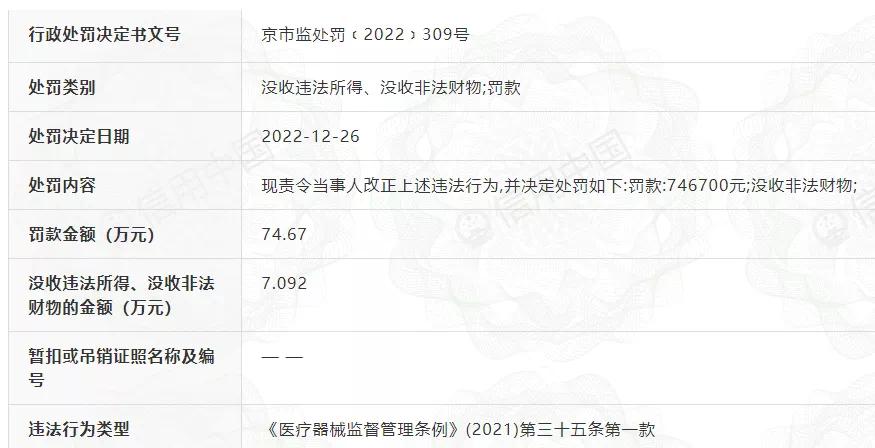 据信用中国网站,北京市市场监督管理局2022年12月开具的行政处罚书显示:瑞莱思2021年11月16日开始生产注射用交联透明质酸钠凝胶(批号:211101),2022年1月11日完成生产,共计生产2489支,质量留样80支。2022年3月21日,北京市药品监督管理局抽检15支产品,经中国食品药品检定研究院检验(检验报告编号:QC202204102),游离透明质酸钠含量项目检验结果为3.5mg/mL,经注册的产品技术要求规定为2.3±0.3,不符合经注册的产品技术要求的规定。2022年6月23日,当事人申请复检。